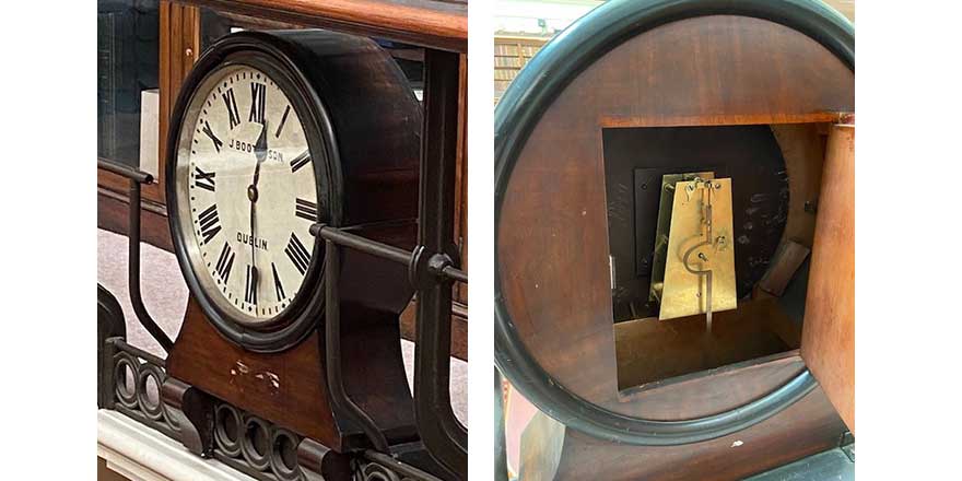 The clock is encased in mahogany. A black dial, hour/minute hands and roman numerals are set against a white face giving it a classical appearance. The name of the clockmaker – J. Booth & Son of Dublin – is printed in the middle of the face. The clock is centrally positioned in the reading room on the gallery level rail between the balustrades for readers to see and hear. As a mechanical spring-driven clock with a pendulum, winding is required periodically to ensure it keeps running and displaying the time accurately. Pendulum clocks were widely used up to the early 20th century and known for their precision.