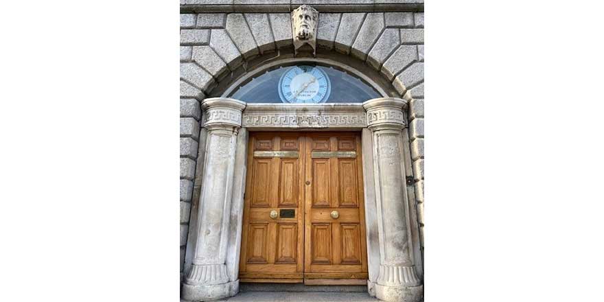 James Booth and his son, also named James, were watch and clock makers located nearby at 4 Stephen’s Green from approximately 1841 to 1868. Today, this site is a coffee shop which one can also while away the time reading and working. Their clocks are still found around Dublin if you look carefully. There is beautiful blue, black and gold one housed in the fanlight at the entrance to the Royal College of Surgeons Ireland (RCSI). Another one, commissioned by the Guinness family, is seen in the clock tower of the walled garden of St. Anne’s Park.