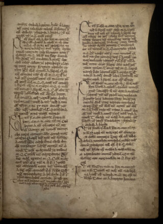 This unique manuscript records episodes in the history of Gaelic Ireland for over three hundred years from AD 1224 to AD 1544, with one later entry added (in different ink) for the year 1562. There are short gaps in the text, from 1378 to 1384 and from 1393 to 1398, where it appears that a pair of leaves has been lost. There is another gap from 1427 to 1432, but without evidence of loss of a text. In this latter case, perhaps there was a leaf missing from the older exemplar being used by the scribe, and no alternative source was available from which entries for those years could be derived.